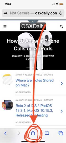 همانطوردر پایین صفحهٔ مروگر Safari مشاهده میشود، یک نوار ابزار وجود دارد که آيکونی در وسط آن به شکل یک مربع که به بالا اشاره میکند، قرار گرفته است؛ به این دکمه به اصلاح دکمهٔ Share یا اشتراک نیز میگویند، روی آن بزنید.